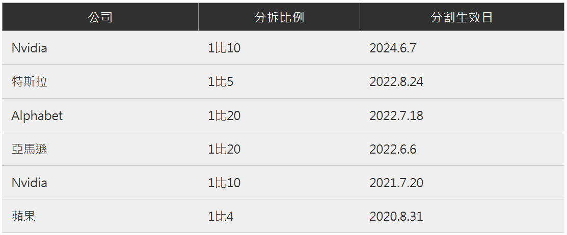 翻開歷史紀錄,Nvidia曾在2021年7月執行過分拆股票,激勵股價一度大漲逾7%。其他科技巨頭也曾執行過拆分股票,包括: