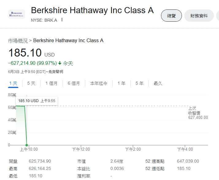 紐約證交所 (NYSE) 周一 (3 日) 因個股熔斷機制 (Limited Up-Limit Down Circuit Breaker, LULD) 技術問題導致部分股票價格顯示異常,大約有數十檔在該交易所上市的股票暫停交易,其中「股神」巴菲特執掌的波克夏公司 (Berkshire Hathaway) (BRK.A-US)A 類股票暴跌近 100%,幾乎為零。