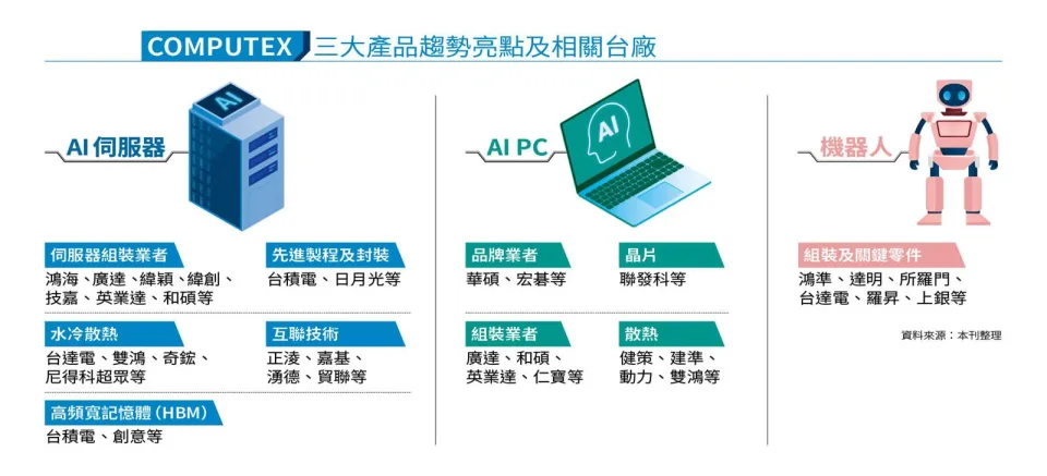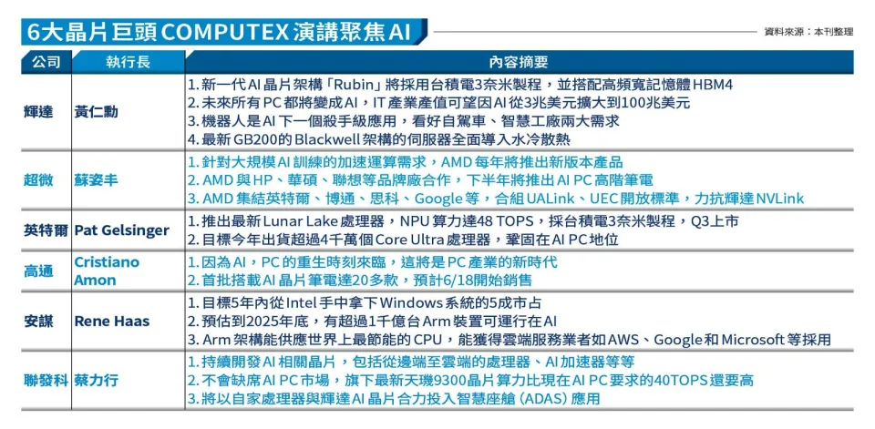 為了找出今年COMPUTEX的重要趨勢,本刊一一聆聽包括輝達黃仁勳、超微蘇姿丰、英特爾季辛格(Pat Gelsinger)、聯發科蔡力行、高通艾蒙(Cristiano Amon)、安謀哈斯(Rene Haas)等重量級人物的主題演講,並彙整出今年展場中3大重要趨勢,以及台灣科技業能獲益的廠商有哪些。