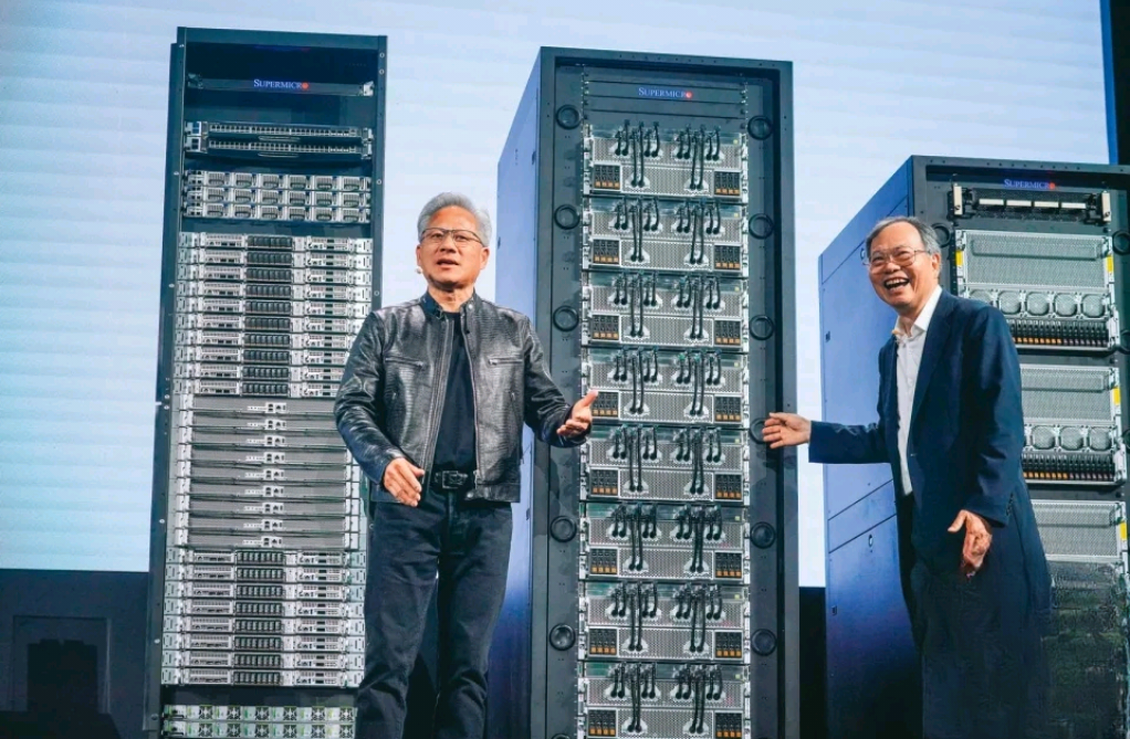 不僅如此,因為高算力引發的散熱問題,黃仁勳特別點名輝達新的DGX GB200 NVL整櫃伺服器將採用水冷散熱技術;該產品也在美超微(Supermicro)創辦人梁見後的主題演講中曝光,受邀站台的黃仁勳用台語稱讚機器:「不但很水,還又酷、又涼。」
