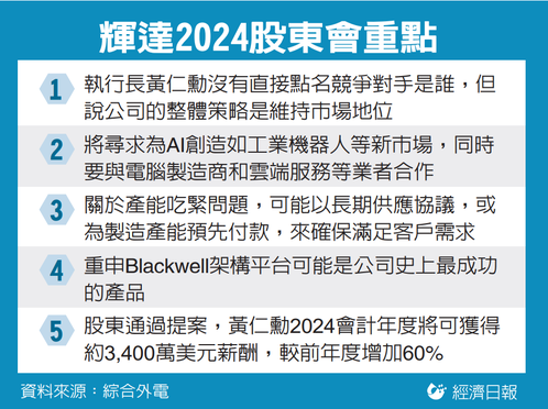 黃仁勳也說,公司的整體策略是維持在市場的地位,尋求為AI創造如工業機器人等新市場,同時要與電腦製造商和雲端服務等業者合作,以達成目標。