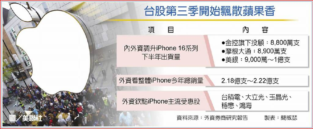 外資在蘋果供應鏈指標股方面也是動作頻仍,花旗環球證券、金控旗下投顧研究機構分別調高光學雙雄大立光、玉晶光推測合理股價至3,560元與832元,摩根士丹利證券日前調高台積電股價預期,所持的理由也與AI iPhone來襲有關,再加上大摩最新升評穩懋「優於大盤」,以及鴻海目標價獲得多家研究機構上調,蘋果即將成熟的果香即將飄香台股。