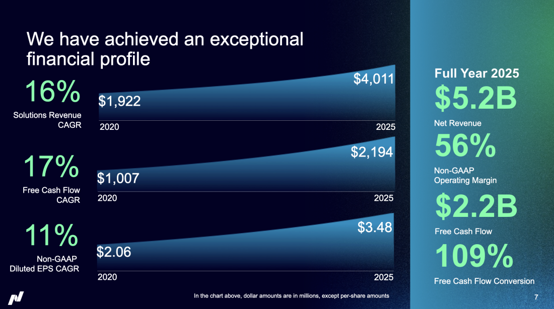 納斯達克 2025 年業績報告的其他關鍵數據包括 109% 的自由現金流轉化率和 56% 的非 GAAP 營業利潤率——這些進壹步表明該公司已變得更具可擴展性和財務韌性。